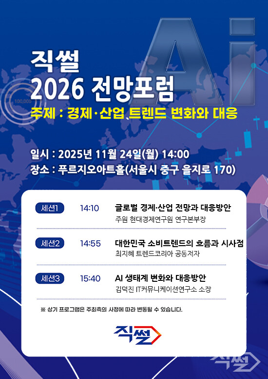 종합인터넷신문 ‘직썰’은 오는 24일 서울 중구 푸르지오아트홀에서 ‘2026년 경제·산업 트렌드 변화와 대응’을 주제로 ‘2026 전망포럼’을 개최한다.